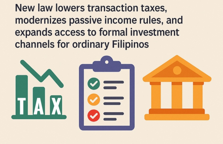 The law slashes the stock transaction tax (STT) from 0.6% to 0.1% and lowers the documentary stamp tax (DST) on the original issuance of shares from 1% to 0.75%. It also removes DST on transactions involving mutual funds and investment trust funds, while standardizing the tax on interest income at 20%.