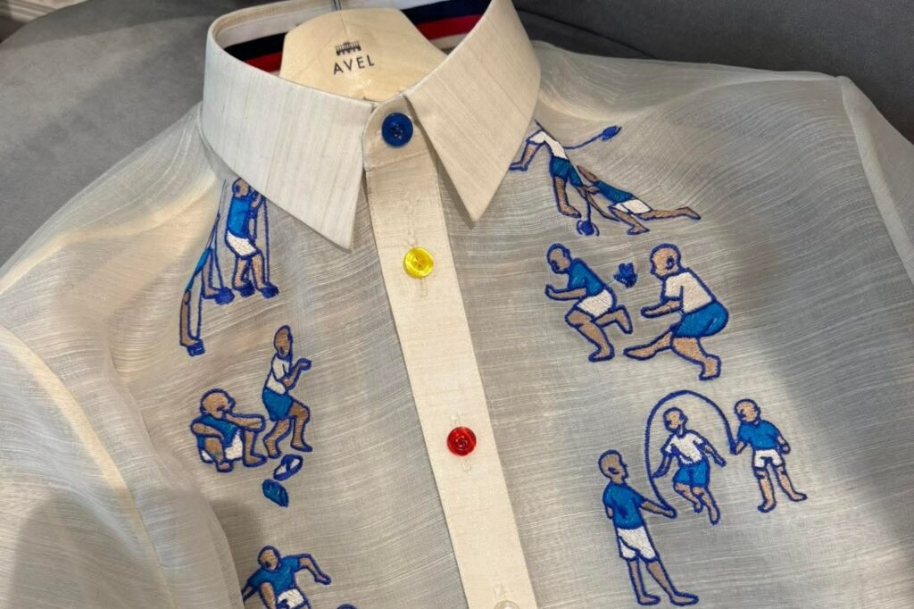 Fashion designer Avel Bacudio’s “Laro ng Lahi” modern barong ensembles will debut tonight, featuring sleek navy and cream silhouettes embroidered with childhood Filipino games like piko and tumbang preso, paired with flag-colored buttons and patterned vests that merge heritage with runway polish.