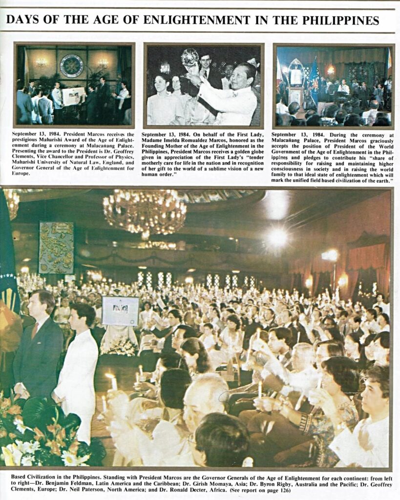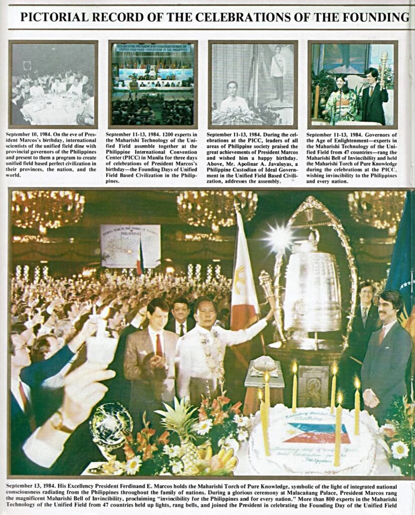 The Washington Post’s William Branigin reported that Marcos and his wife, First Lady Imelda Romualdez-Marcos, were proclaimed the “founding father” and “founding mother” of the Maharishi movement’s so-called “age of enlightenment,” a title bestowed amid birthday fanfare, golden torches, and chants of spiritual triumph on September 11–13, 1984.